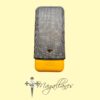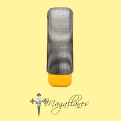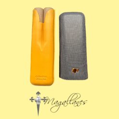 - Purera de piel de la región de Ubrique en colores negro, amarillo y blanco cuadrado pequeño con logotipo dorado de la marca Cohiba.